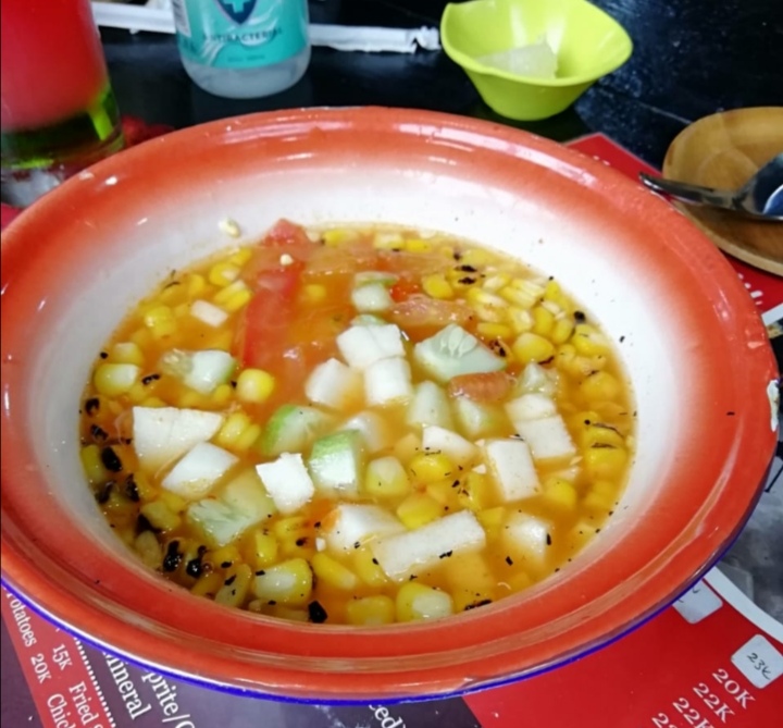 5. Siapkan mangkuk, masukkan campuran jagung, timun dan bengkuang. Tuang rebusan air cabai. Tabur abon ebi.
