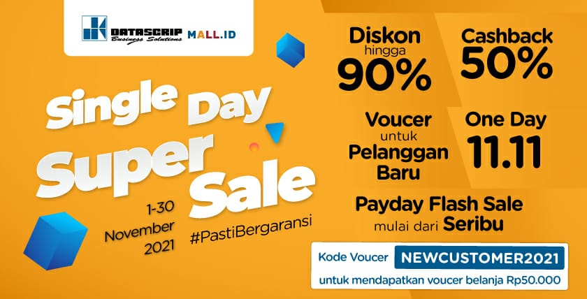 wanitaindonesia.co – Jelang akhir tahun 2021, DatascripMall.ID sebagai portal belanja online dari pt. Datascrip yang menyediakan berbagai produk berkualitas dan layanan purnajual yang prima untuk kebutuhan bisnis dan perkantoran menghadirkan promo Single Day Super Sale #PastiBergaransi, berupa diskon hingga 90% untuk berbagai produk, ekstra voucer cashback 50%, Payday Flash Sale, One Day Super Sale 11.11, hingga voucer bagi pelanggan baru selama bulan November 2021 ini.