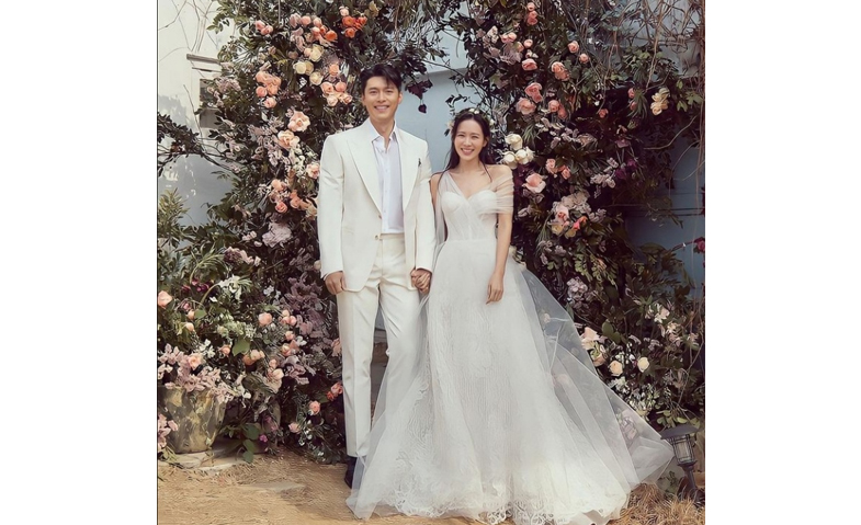 Foto pasangan yang banyak di publish di media Son Ye Jin menggunakan gaun pengantin putih dengan veil hitam karya Vera Wang dan Elie Saab.